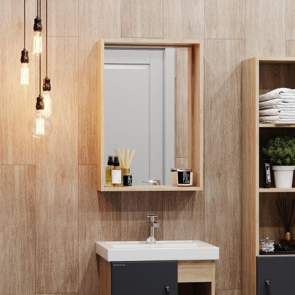 Зеркало в ванную комнату Onika ТИМБЕР 48 отражает современные тенденции в дизайне мебели для ванных комнат: минимализм с простыми и понятными формами, цвета дуба с роскошной текстурой, отсутствие лишних деталей.