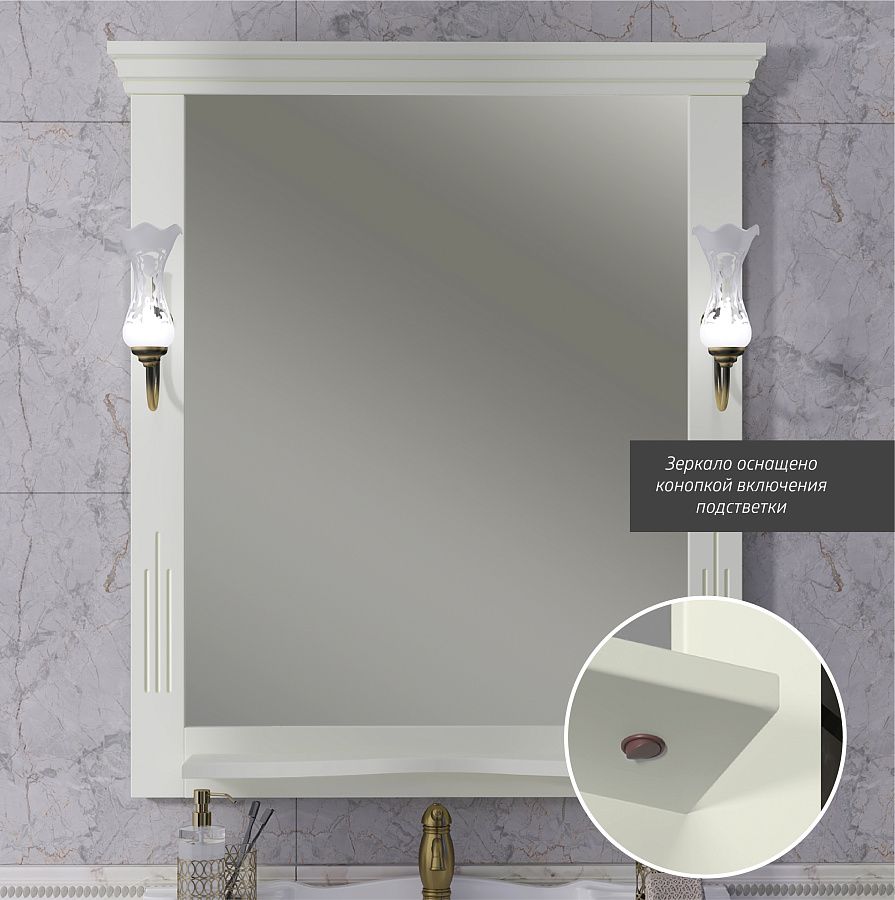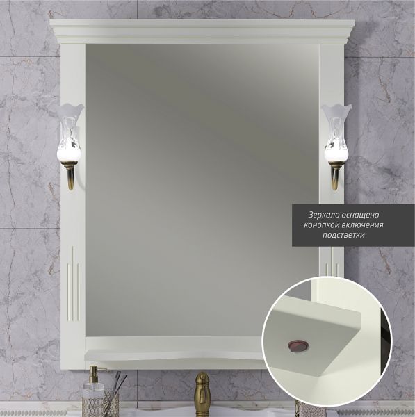 Светильники приобретаюся отдельно.Зеркала по умолчанию идут с отверстиями под светильники. В случае отсутствия необходимости заказа светильников, возможна комплектация зеркала декоративными накладками серебро или бронза.Коллекция Риспекто символизирует лучшие традиции неоклассики в сочетании с необыкновенной функциональностью и простотой дизайна.Строгий контроль при изготовлении изделий исключает наличие малейших дефектов. Зеркальное полотно дает четкое отражение без каких-либо искажений. Слоновая кость цвет прекрасно дополнит интерьер ванной комнаты.