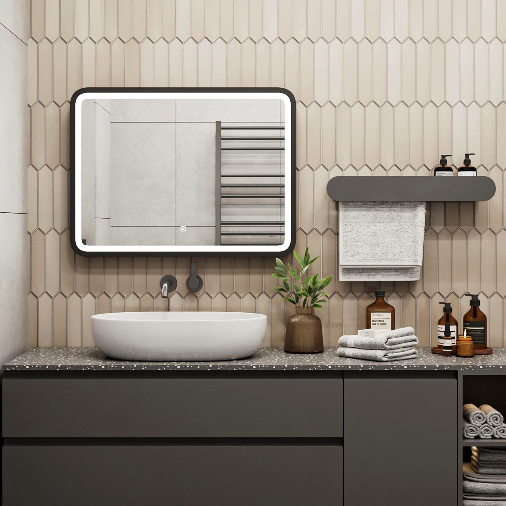 Зеркало Reflexion Happy прекрасно дополнит интерьер как ванной комнаты, так и прихожей, спальни или гостиной. Компактные размеры позволяют разместить зеркало даже в небольших помещениях. Использование качественных, современных материалов обеспечивает долгий срок службы изделия. Защита по стандарту IP44 позволяет эксплуатировать изделие в помещениях с повышенной влажностью. Сенсорный датчик включения невероятно удобен в использовании. Яркие светодиоды холодного свечения обеспечивают равномерную подсветку и создают уют в помещении. Отличное зеркало для макияжа. Тонкая черная рама создает парящий эффект, зеркало выглядит легким, воздушным, визуально расширяет пространство. Надежная упаковка защищает зеркало во время доставки. Зеркало Reflexion станет отличным подарком вашим близким и любимым.