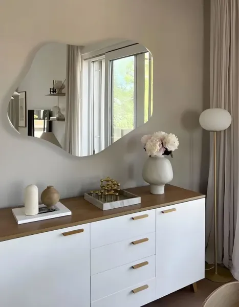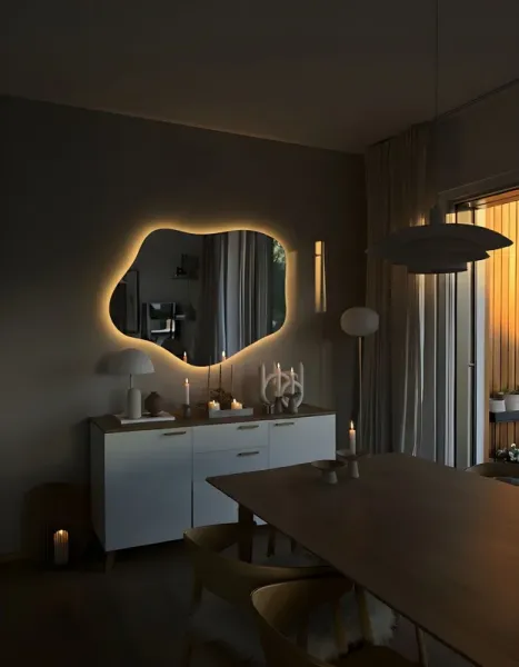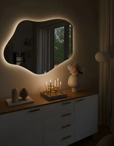 Ореольная подсветка подчеркивает форму зеркала и создает эффект "парения".
