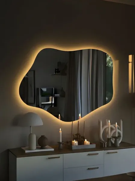 Зеркало креативной формы для ванной комнаты и интерьеров, оснащенное светодиодной LED подсветкой с диммером .