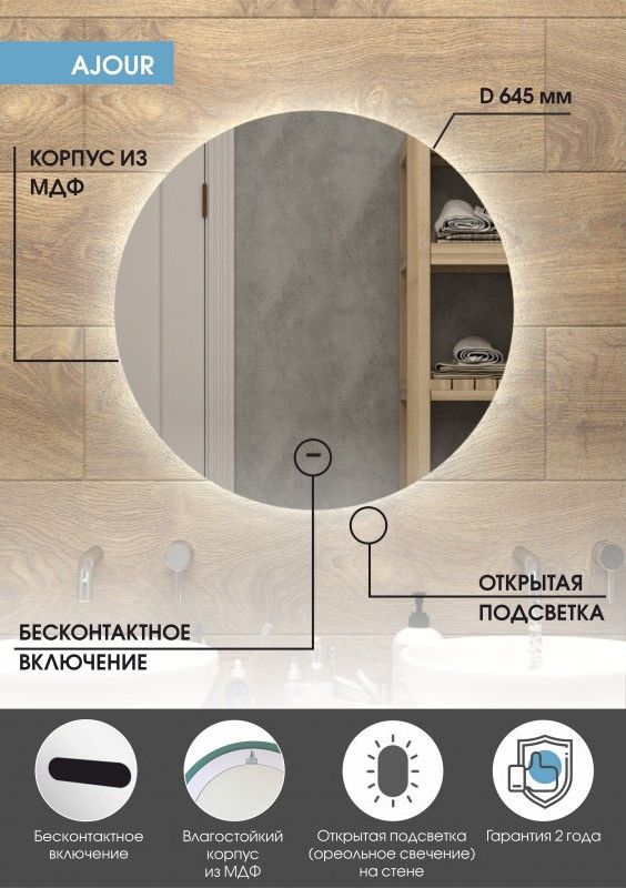 Зеркало "Ajour" D 650 с бесконтактным сенсоромLED подсветка 6000Кбесконтактный сенсор с функцией димированияореольная подсветка