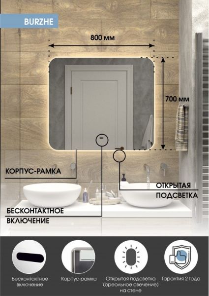 Зеркало "Burzhe Led" 800х700 с бесконтактным сенсором, холодная подсветкаLED подсветка 6000Кбесконтактный сенсор с функцией димированияореольная подсветка