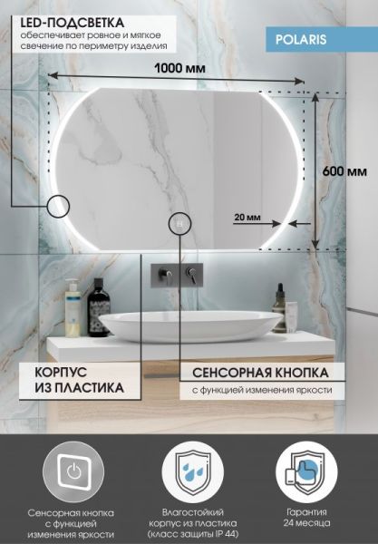 Зеркало "Polaris Led" 1000х600LED подсветка 6000Ксенсорный выключатель с функцией димированияореольная подсветка (по бокам)