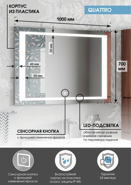 Зеркало "Quattro Led" 1000х700LED подсветка 6000Ксенсорный выключатель с функцией димирования