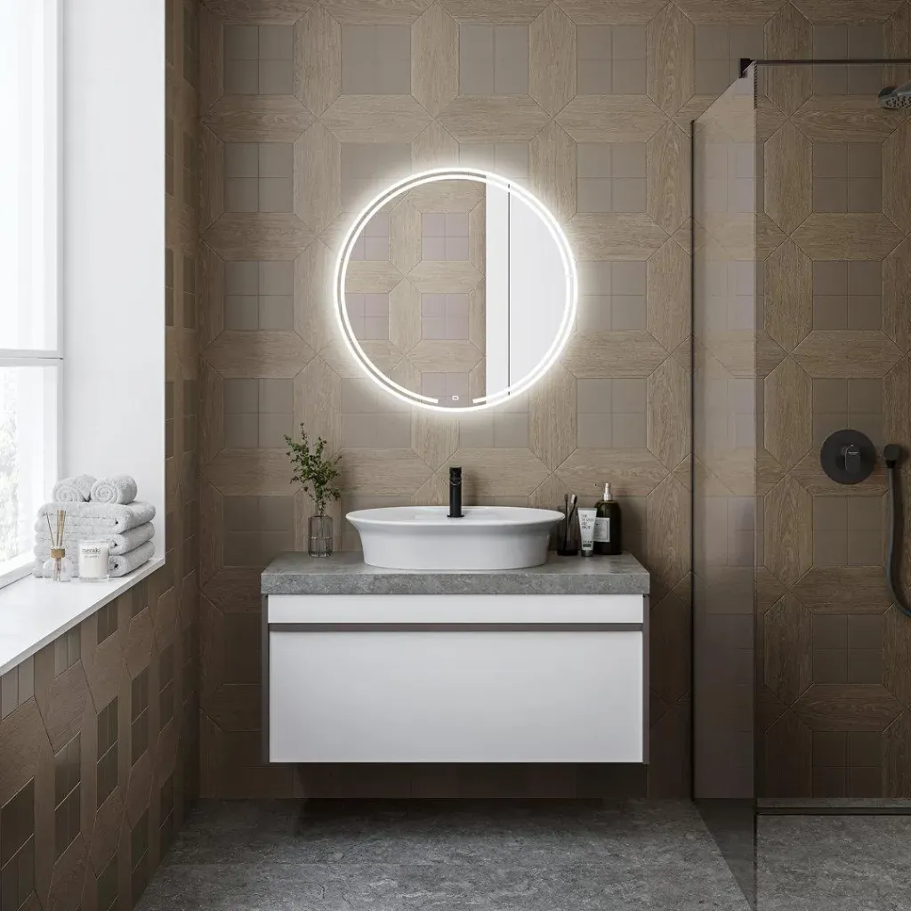 Зеркало MiO выполнено с деликатной подсветкой по периметру. Светодиодная подсветка включается одним прикосновением к сенсору в нижней части зеркального полотна, там же нанесён логотип KERAMA MARAZZI. Имеется встроенный диммер.