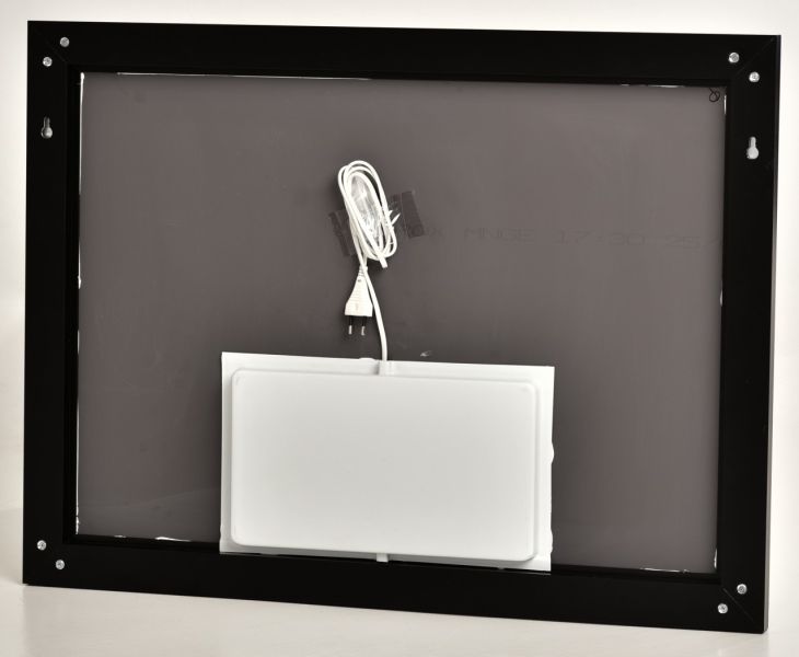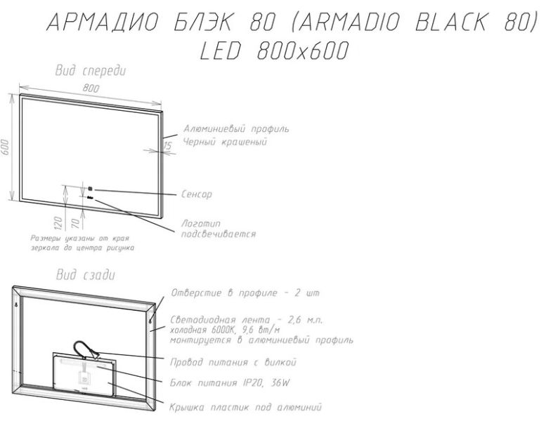 Зеркало ARMADIO BLACK 80, 800х600 с подсветкой. Алюминиевым профилем и сенсорным выключателем. Потребляемая мощность 29 W. Класс защиты IP44. Стеклянное зеркальное полотно Mirox производства компании AGC Glass Russia, принадлежащей международной группе мирового лидера по производству стекла AGC Inc. LED подсветка, алюминиевый профиль, сенсорный выключатель, блок питания, крепление зеркала (кронштейн с крюком), клеммник, сетевой шнур. Материал корпуса - Анодированный алюминий (профиль), задняя стенка пластик (АБС). Можно использовать в любом помещение: ванная и туалет, прихожая, спальня, гостиная.