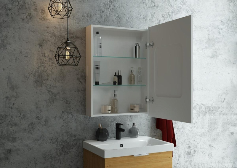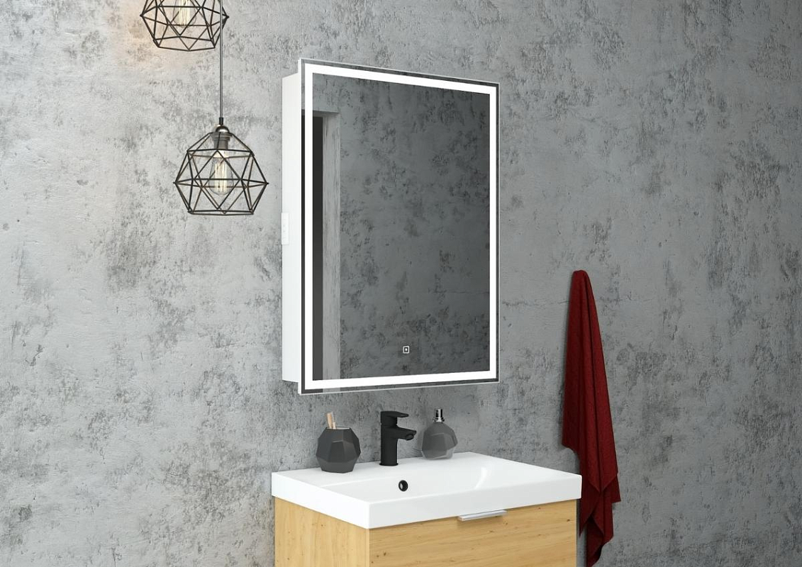 Зеркало-шкаф "Allure LED" 550х800 правый с розеткойLED подсветка 6000К; сенсорный включатель с функцией димирования, розетка, Материал корпуса - влагостойкий ЛДСП + МДФ в пленке ПВХ