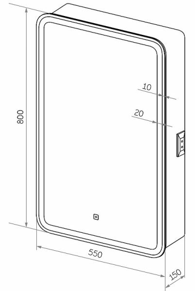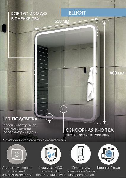Зеркало-шкаф "Elliott LED" 550х800 левый с розеткойLED подсветка 6000К; сенсорный включатель с функцией димирования, Материал корпуса- МДФ, пленка ПВХ, розетка