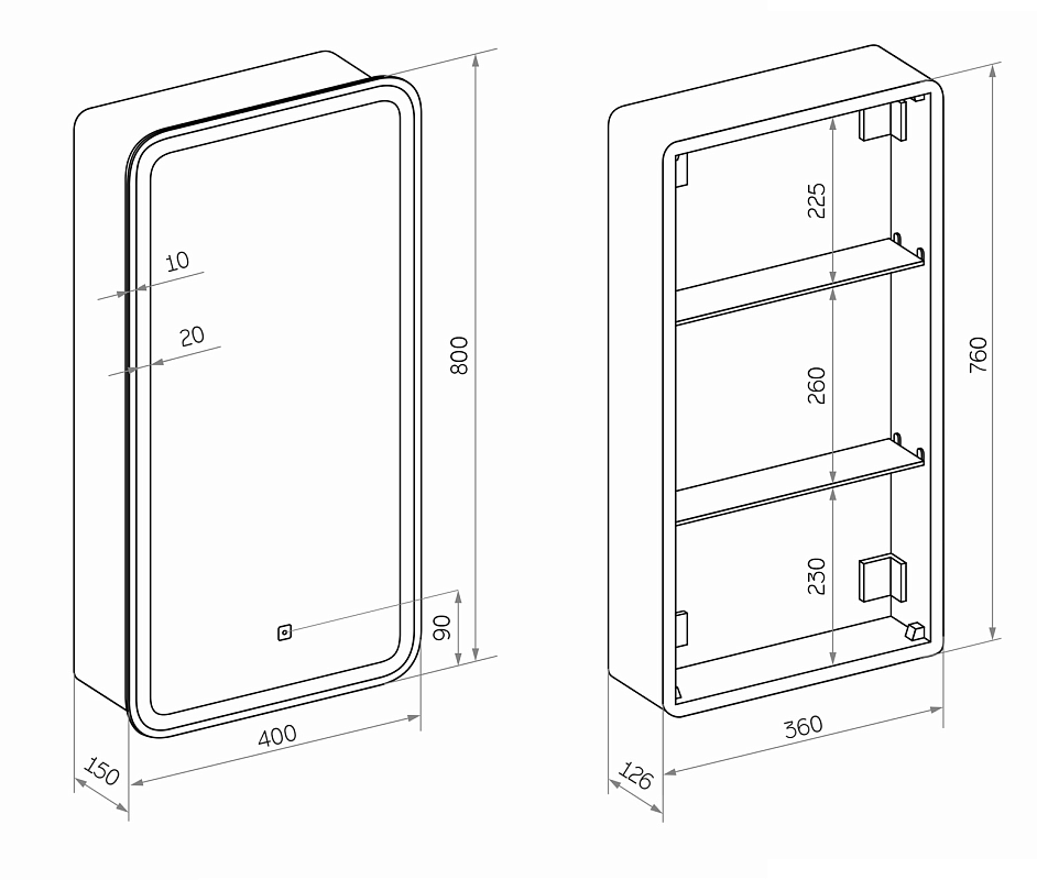 Зеркало-шкаф "Elliott LED" 400х800 левый с розеткойLED подсветка 6000К; сенсорный включатель с функцией димирования, Материал корпуса- МДФ, пленка ПВХ, розетка