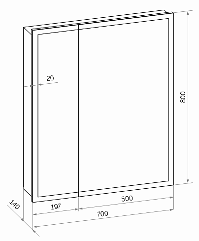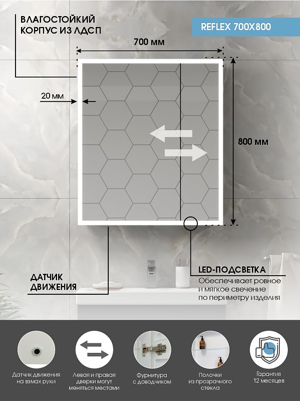 Зеркало-шкаф "Reflex LED" 700х800 с датчиком движенияLED подсветка 6000К; ДД, пластиковый короб, прямые углы на коробе и зеркале, полка/2 шт, без розетки, пескоструйная полоса без отступа, 2 створки (200х500)